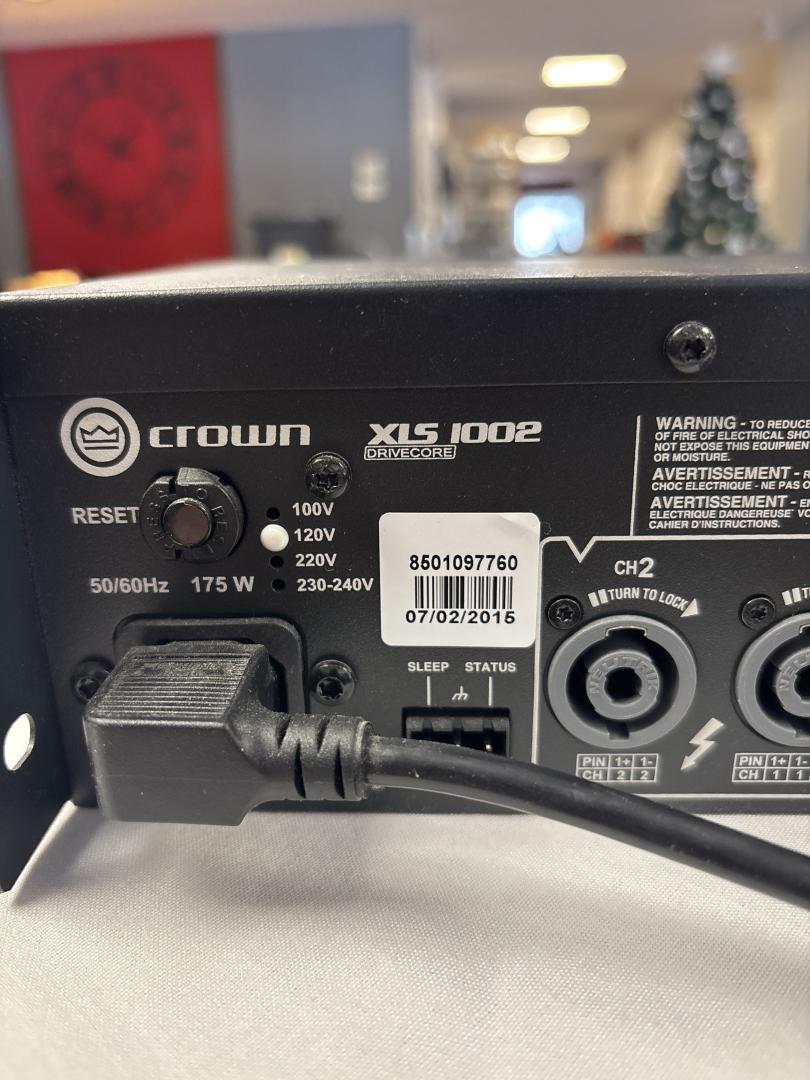 Online since 28 January 2026Crown XLS 2502 amplifier, featuring an LCD screen, individual gain controls, and DSP crossover settings. Functional