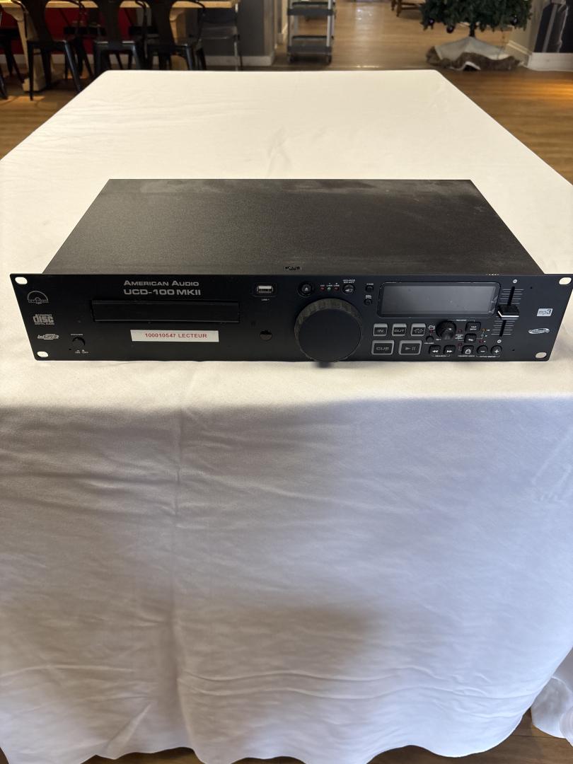 Online since 28 January 2026American Audio UCD-100 MKII CD/MP3 Player. Single rack-mountable CD/MP3 player (19 inches). Compatible with MP3 discs, CDs, CD-Rs, and CD-RWs. The CD drive does not open, but the rest appears to be functional.