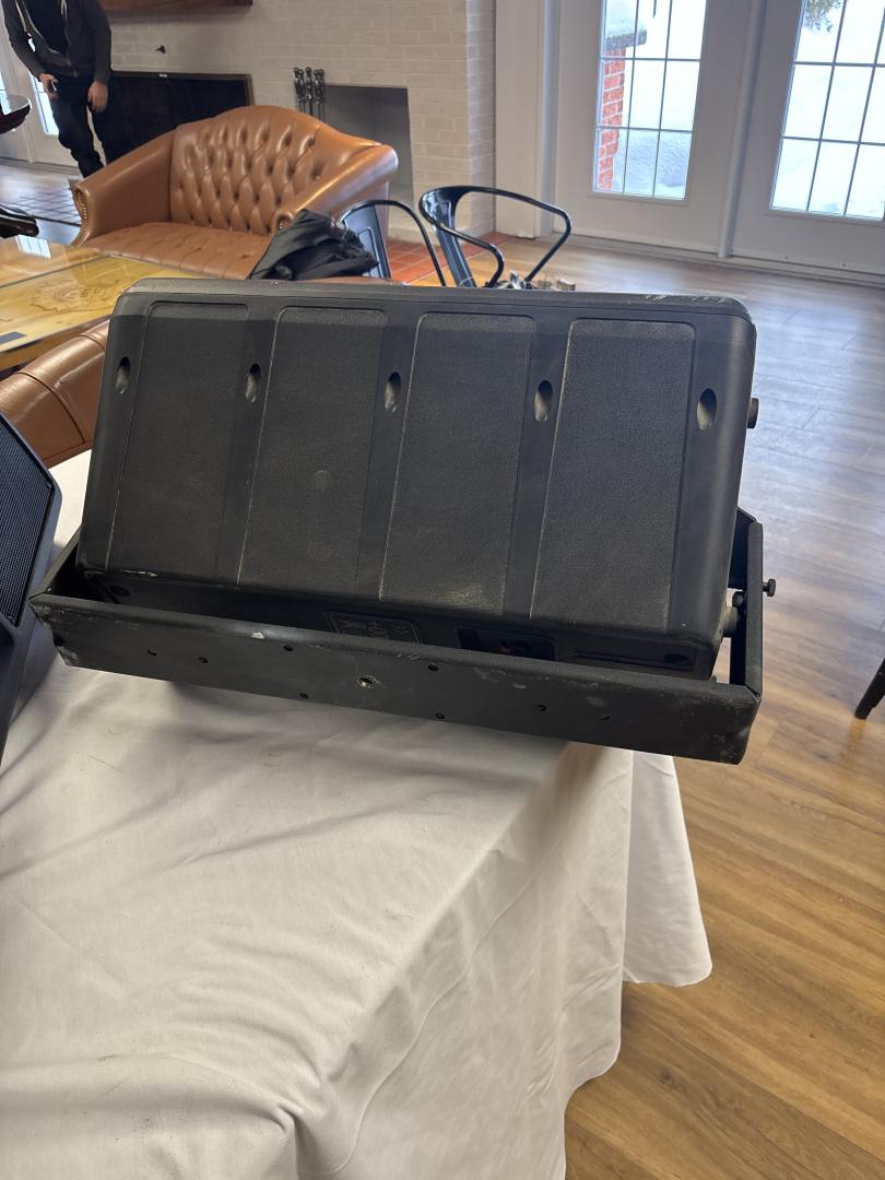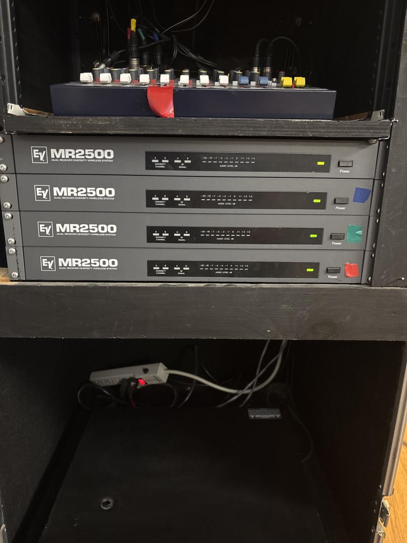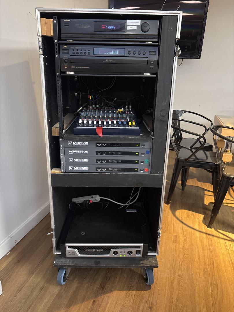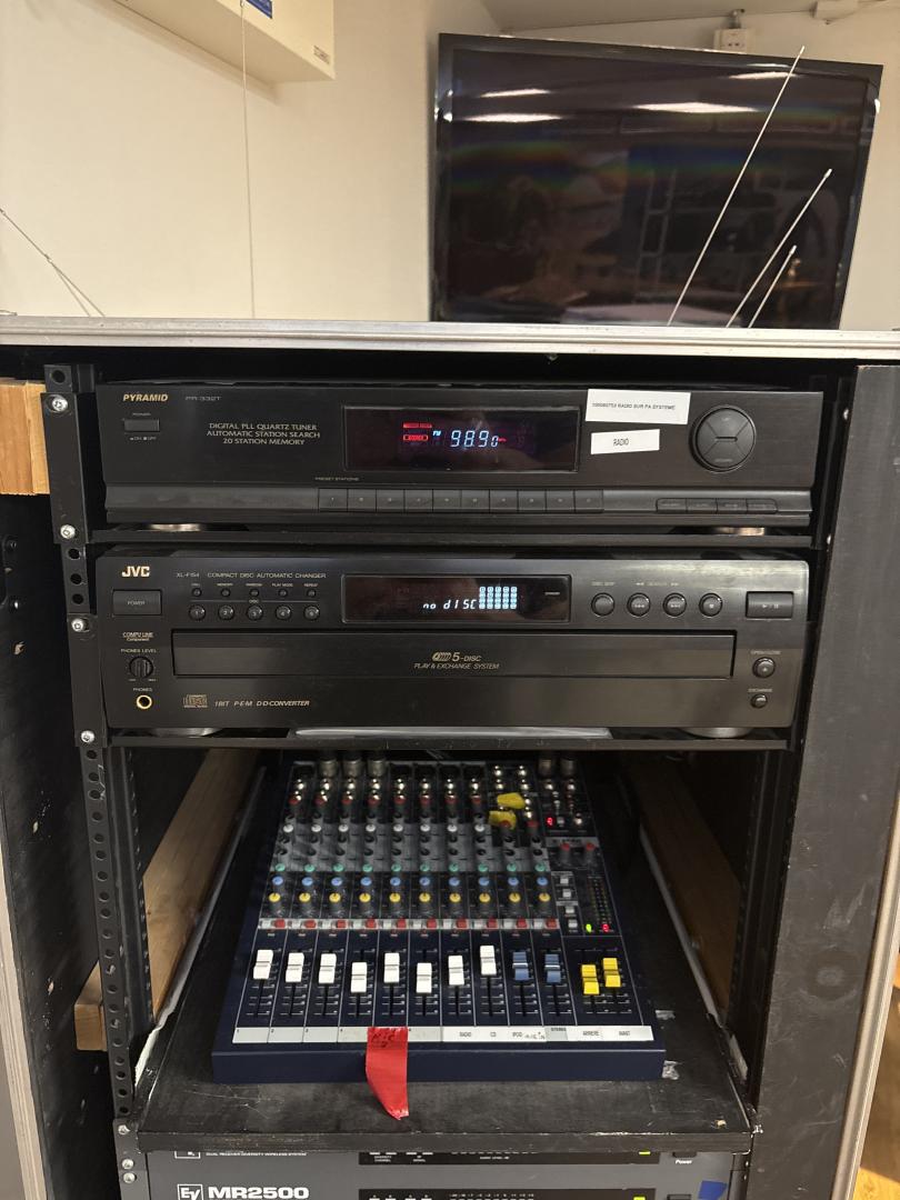 Online since 28 January 2026Professional audio equipment rack. It contains four EV MR2500 power amplifiers. A compact audio mixer. A JVC CD/DVD player is mounted in the rack. A PYRAMID brand AM/FM digital stereo tuner. A Crest Audio CC1800 professional power amplifier. The rack is on casters for easy transport. The box lid is missing.