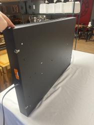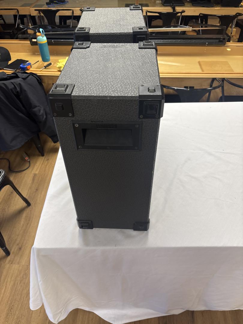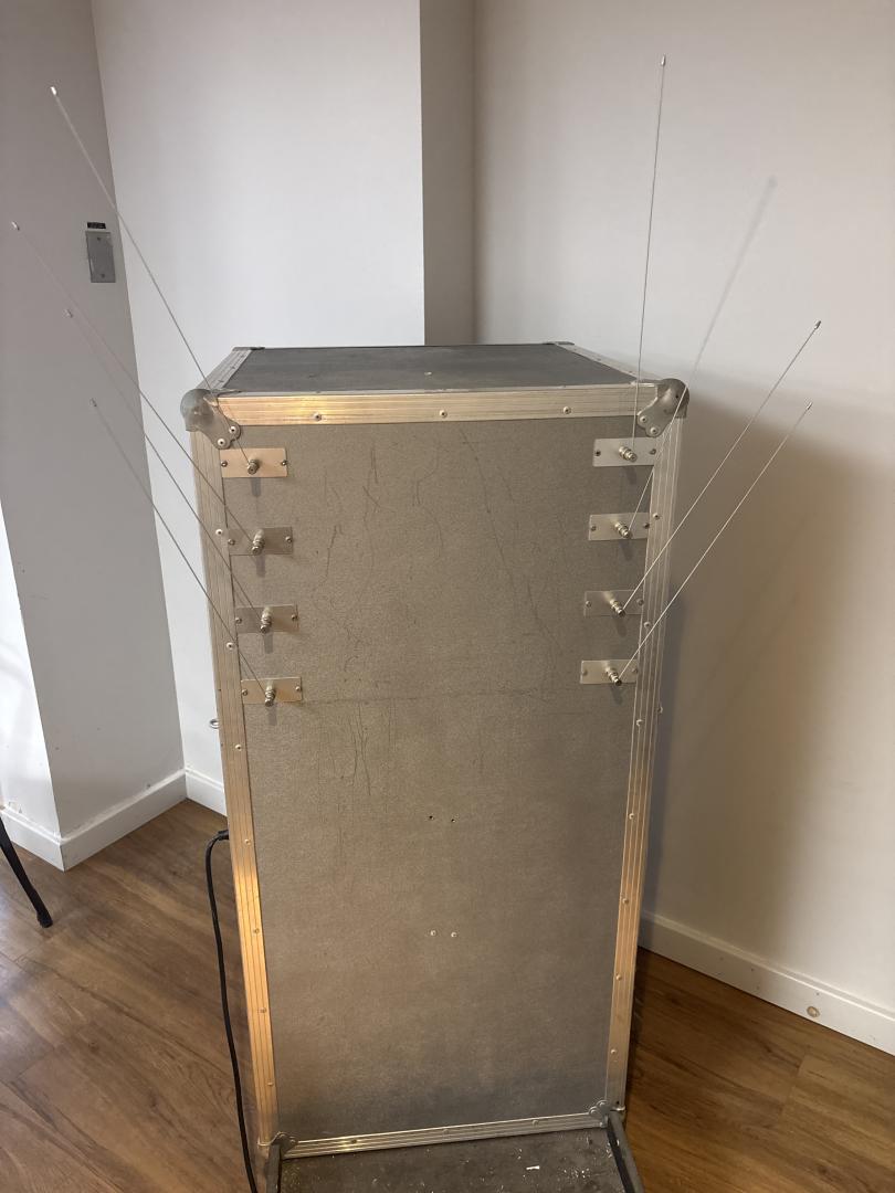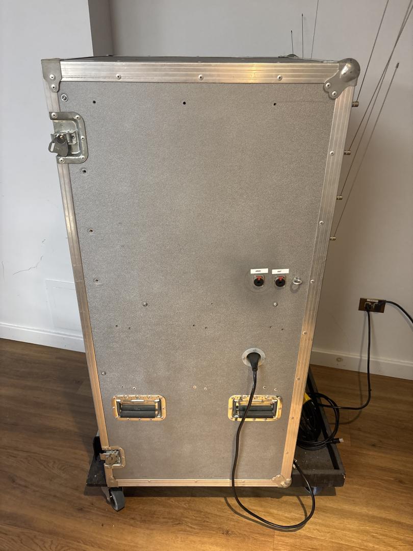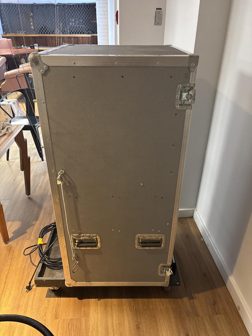 Online since 28 January 2026Professional audio equipment rack. It contains four EV MR2500 power amplifiers. A compact audio mixer. A JVC CD/DVD player is mounted in the rack. A PYRAMID brand AM/FM digital stereo tuner. A Crest Audio CC1800 professional power amplifier. The rack is on casters for easy transport. The box lid is missing.
