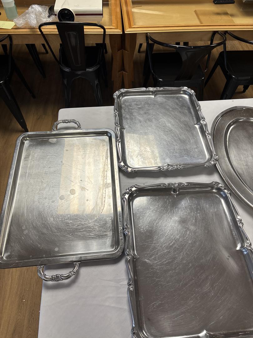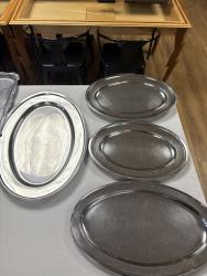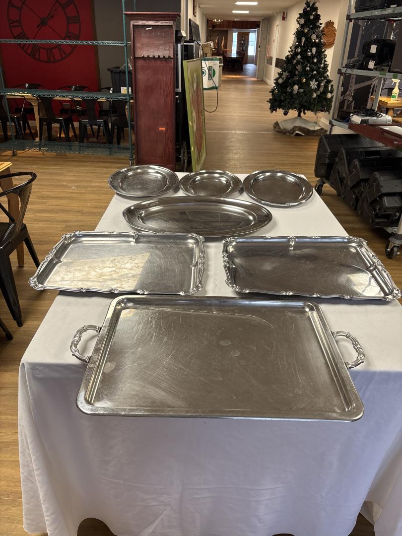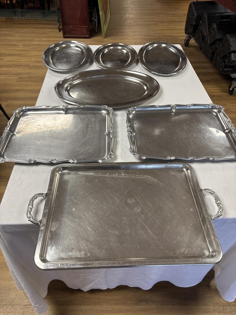 Online since 28 January 2026Metal serving trays and plates. 4 oval trays and 3 rectangular trays. Your bid is for the lot.